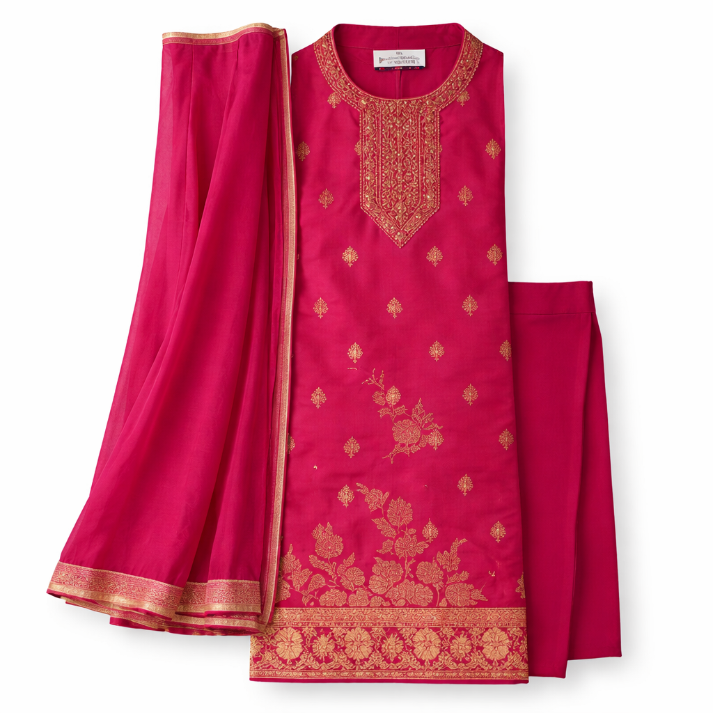 Add grace and charm to your ethnic wardrobe with this elegant pink women’s suit set. Crafted with a rich fabric and highlighted with delicate golden motifs, this suit set comes with a matching dupatta that enhances its festive appeal. Ideal for weddings, celebrations, parties, and traditional functions, this outfit offers both comfort and timeless style. Pair it with ethnic jewelry and heels for a complete festive look.