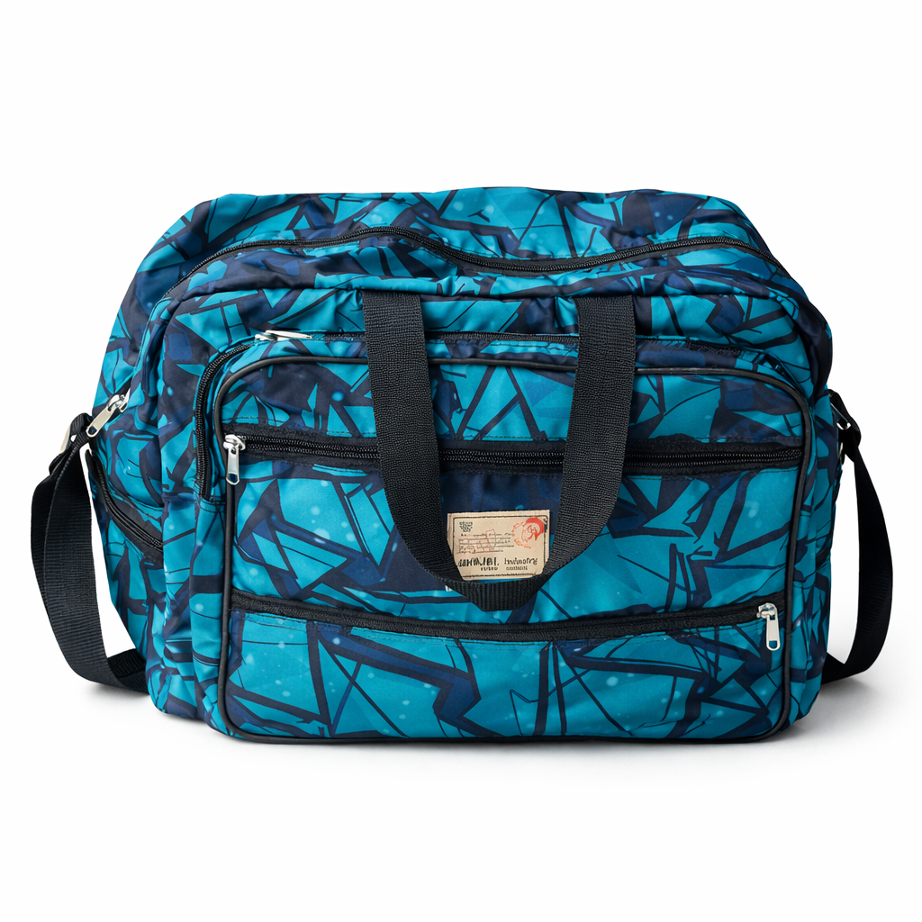 This modern teal geometric printed duffel bag is designed for travel, gym, and everyday use. Made from durable, high‑quality fabric, it offers a spacious main compartment along with multiple zippered pockets for organized storage of clothes, accessories, and essentials. Strong dual carry handles and an adjustable shoulder strap ensure comfortable carrying in any situation. The eye‑catching geometric print adds a stylish touch, making this bag a perfect blend of functionality and contemporary design for daily and travel needs.